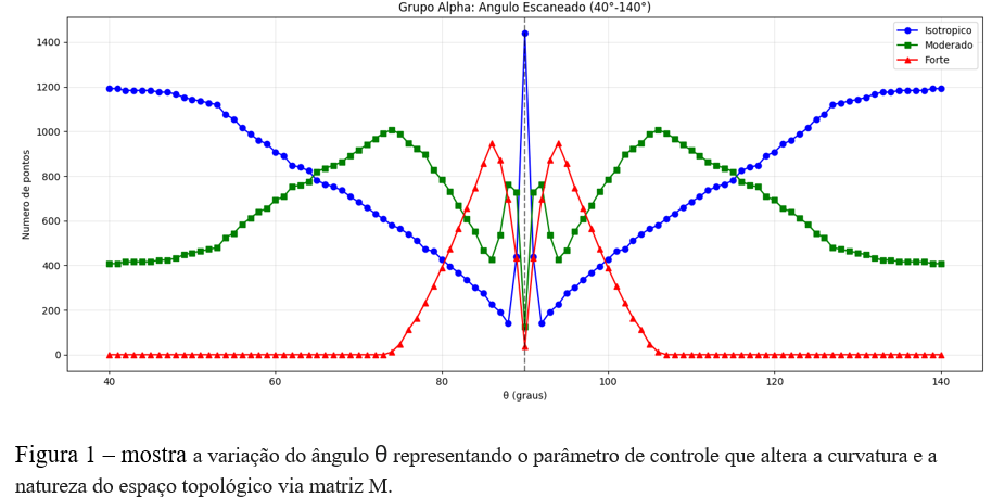 Geometria de Carnot–Carathéodory (Sub-Riemanniana): Esta é a fase mais complexa, onde o movimento é restrito a certas direções (anisotropia severa – Vermelho). No gráfico, isso é visível o peso geométrico efetivo associado a determinadas direções se anula em determinados ângulos, indicando “direções proibidas” ou restrições não-holonômicas típicas desses sistemas. Ângulo ideal para anisotropia máxima: 86.0°.