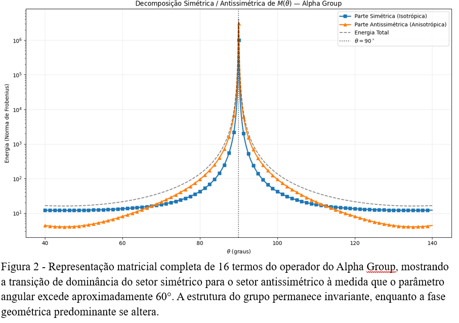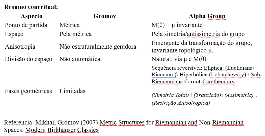 O Programa de Erlangen define a geometria por grupos de simetria e invariantes, mas não explicita mecanismos internos de transição entre diferentes regimes geométricos. O Grupo Alpha introduz a antissimetria como motor das transições, tornando a geometria dinâmica e emergente. Tal proposta vai um passo além porque agora temos: a topologia que muda com o ângulo θ. Fases geométricas emergentes: Euclidiano-Riemann, Lobachevsky e Sub-Riemann Carnot-Caratheodory. Caminhos de Hörmander garantindo acessibilidade mesmo em regimes sub-Riemannianos e Invariante μ como âncora de coerência.